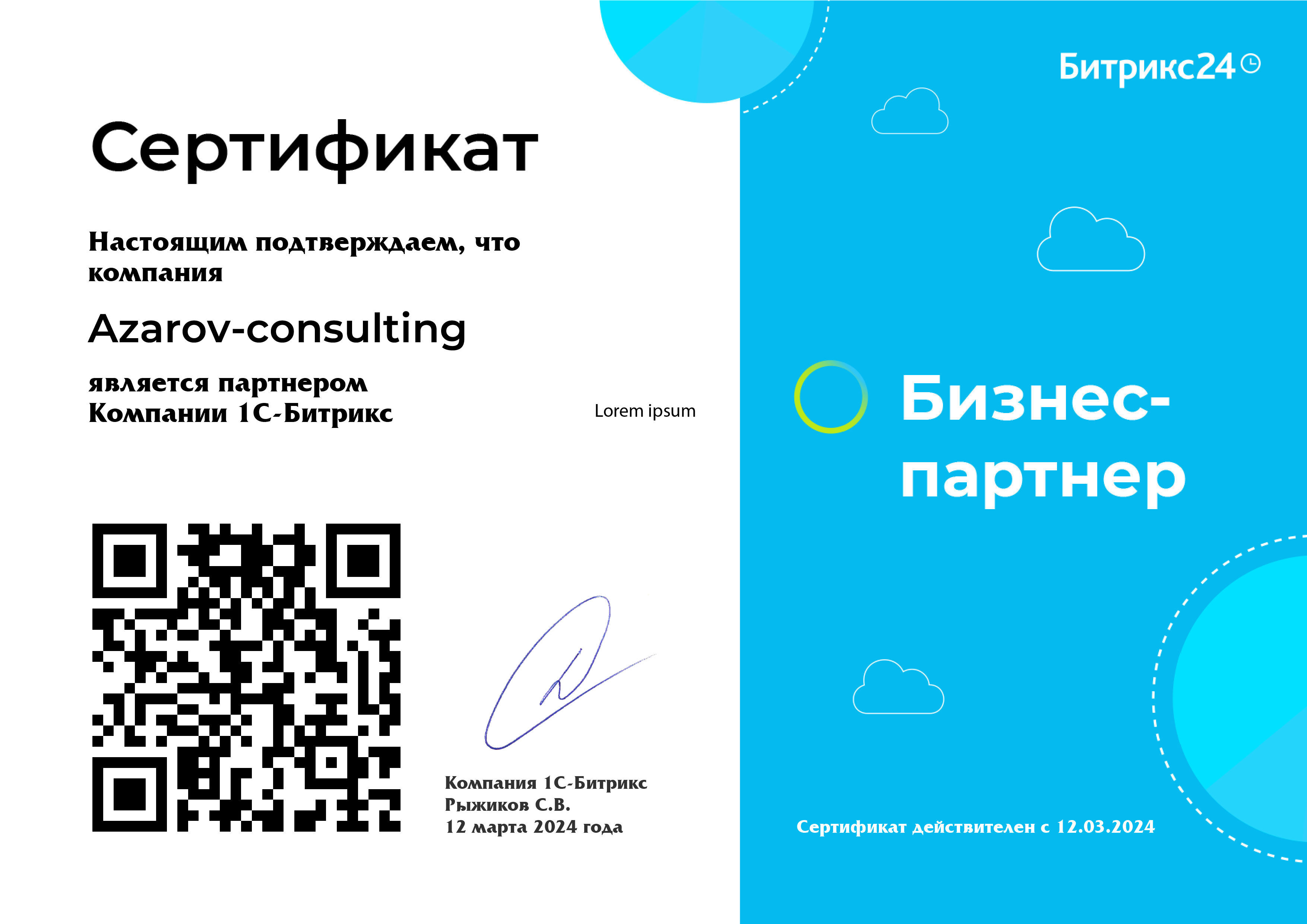 С 2023 года — по настоящее время — Azarov Consulting. Проектный менеджер и технический директор. Официальный партнер Bitrix24.